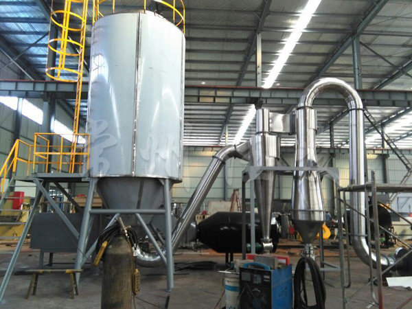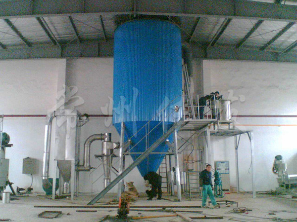 本機(jī)是將料液壓入壓力噴嘴霧化成微小霧滴,在塔內(nèi)與熱風(fēng)以對(duì)流的方式完成干燥,獲得顆粒產(chǎn)品。